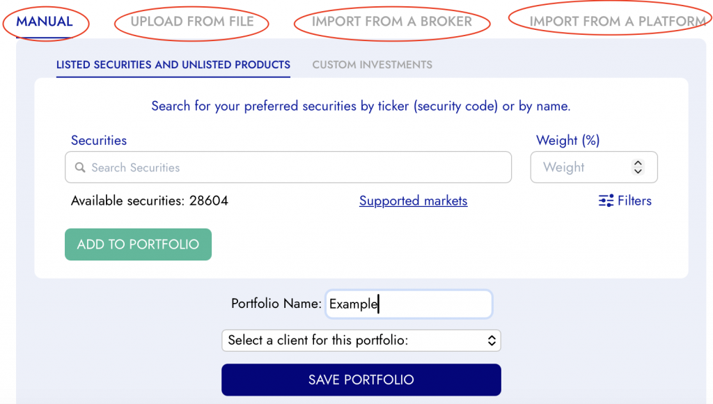 A) Create the portfolio that you want to use later as benchmark, using one of the provided options: manually, import from CSV or import from a broker or platform.