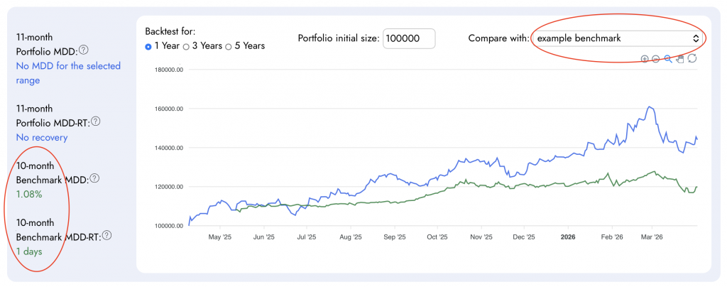 Note that information about the benchmark Maximum drawdown and Recovery time is also available in the Backtest screen.